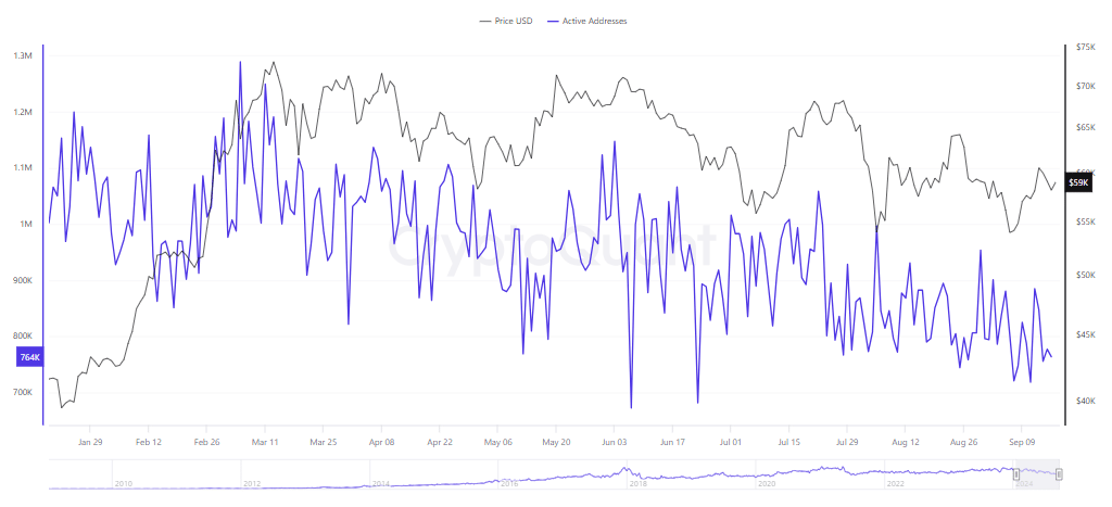 Según los datos de CryptoQuant, el número de direcciones activas de BTC ha caído de 885,329 a 764,033, lo que indica un posible cambio en el sentimiento del mercado, con una inclinación bajista por parte de los participantes. Esta reducción de actividad podría ser un indicador de que los inversores están mostrando menos confianza en el corto plazo.