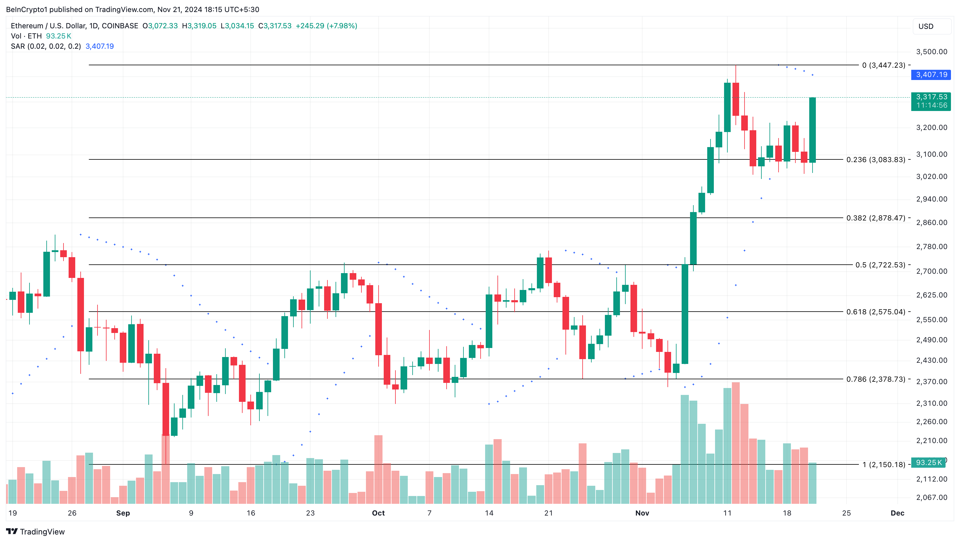 Al momento de escribir esto, ETH se negocia a 3,317 dólares, lo cual es un cierre más alto que el de ayer. A pesar de eso, la altcoin todavía está por debajo del indicador Parabolic Stop And Reverse (SAR).