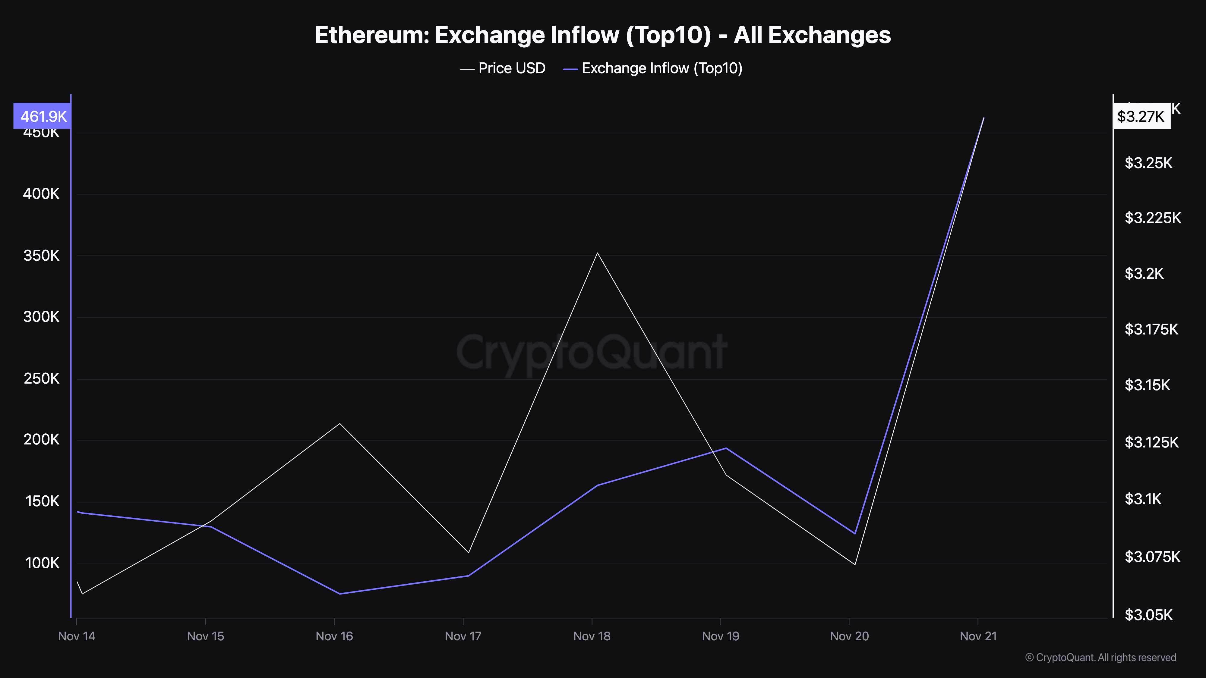 Además, la disparidad en el rendimiento de Ethereum se puede atribuir en gran medida a la presión de venta sostenida. Por ejemplo, los datos de CryptoQuant revelan que las entradas a los 10 principales exchanges han subido a 461,901 ETH, valorados en aproximadamente 1.50 mil millones de dólares al momento de escribir esto.