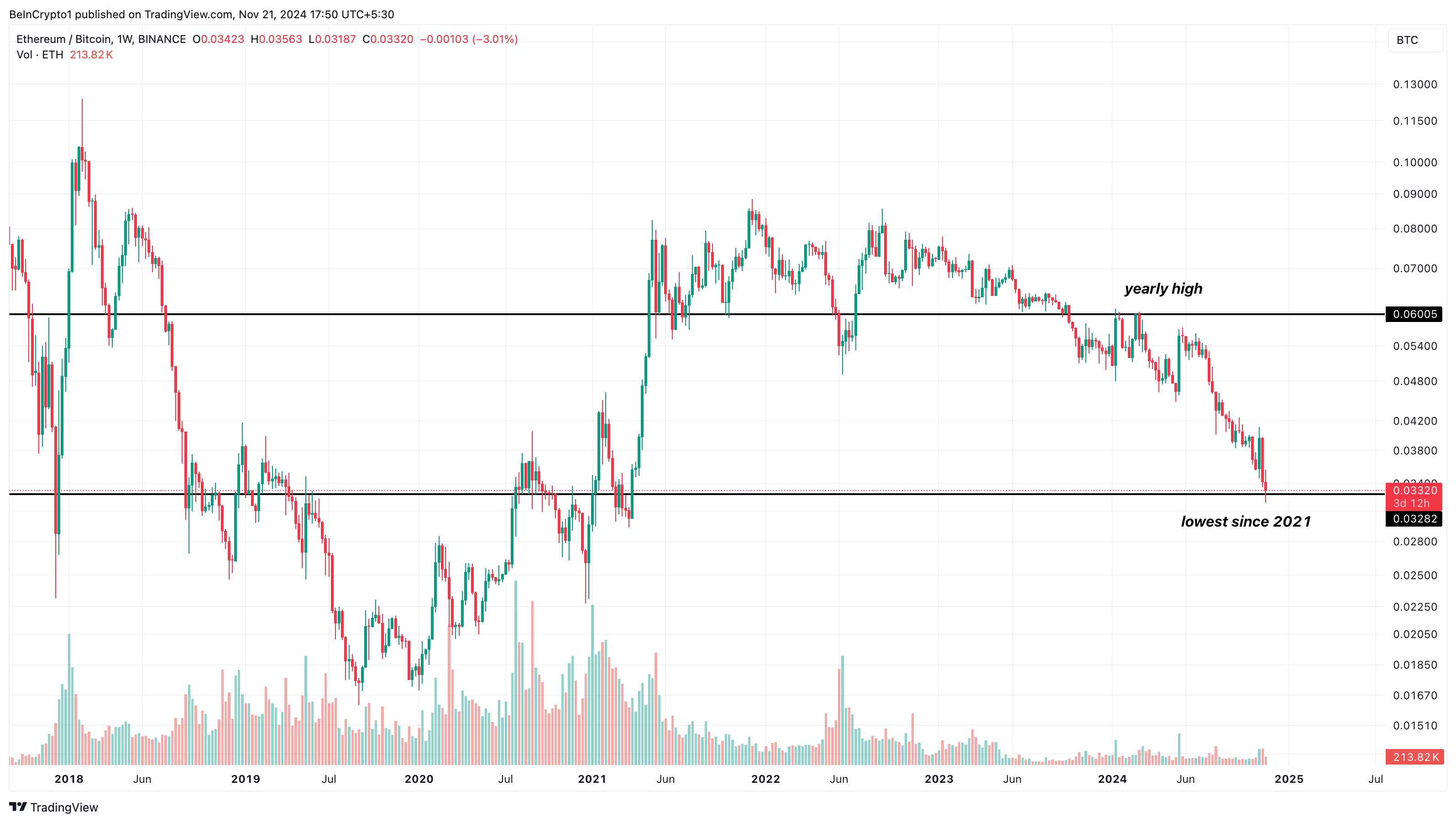 La relación ETH/BTC, una métrica que mide el rendimiento del precio de Ethereum en comparación con Bitcoin, ha alcanzado su punto más bajo desde marzo de 2021. Este desarrollo se produce en medio del breve aumento de BTC a 98,000 dólares.