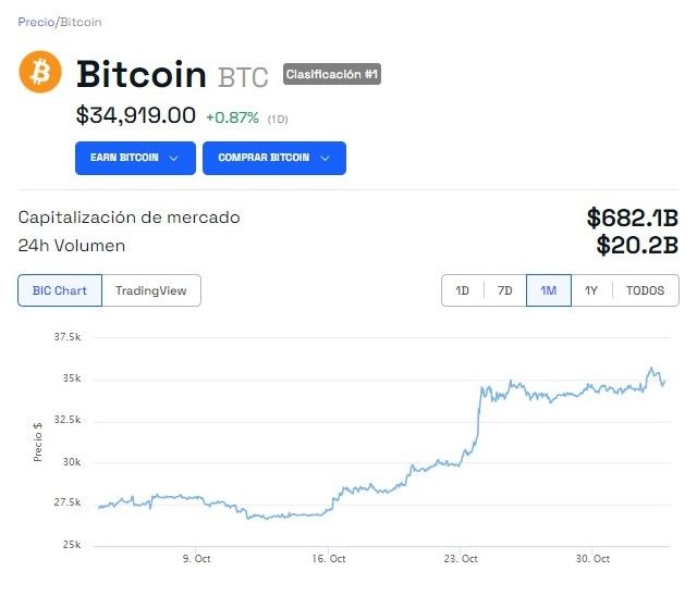 El valor de la criptomoneda más famosa, al momento de esta redacción, es de 34919 dólares por unidad. Esto quiere decir que la moneda digital tuvo un alza de 0,87% en el último día. Actualmente, Bitcoin se encuentra en el lugar #1 de popularidad en el mercado digital. Cabe recordar que el máximo anterior de la criptomoneda se registró en noviembre de 2021 en alrededor de 69,000 dólares.