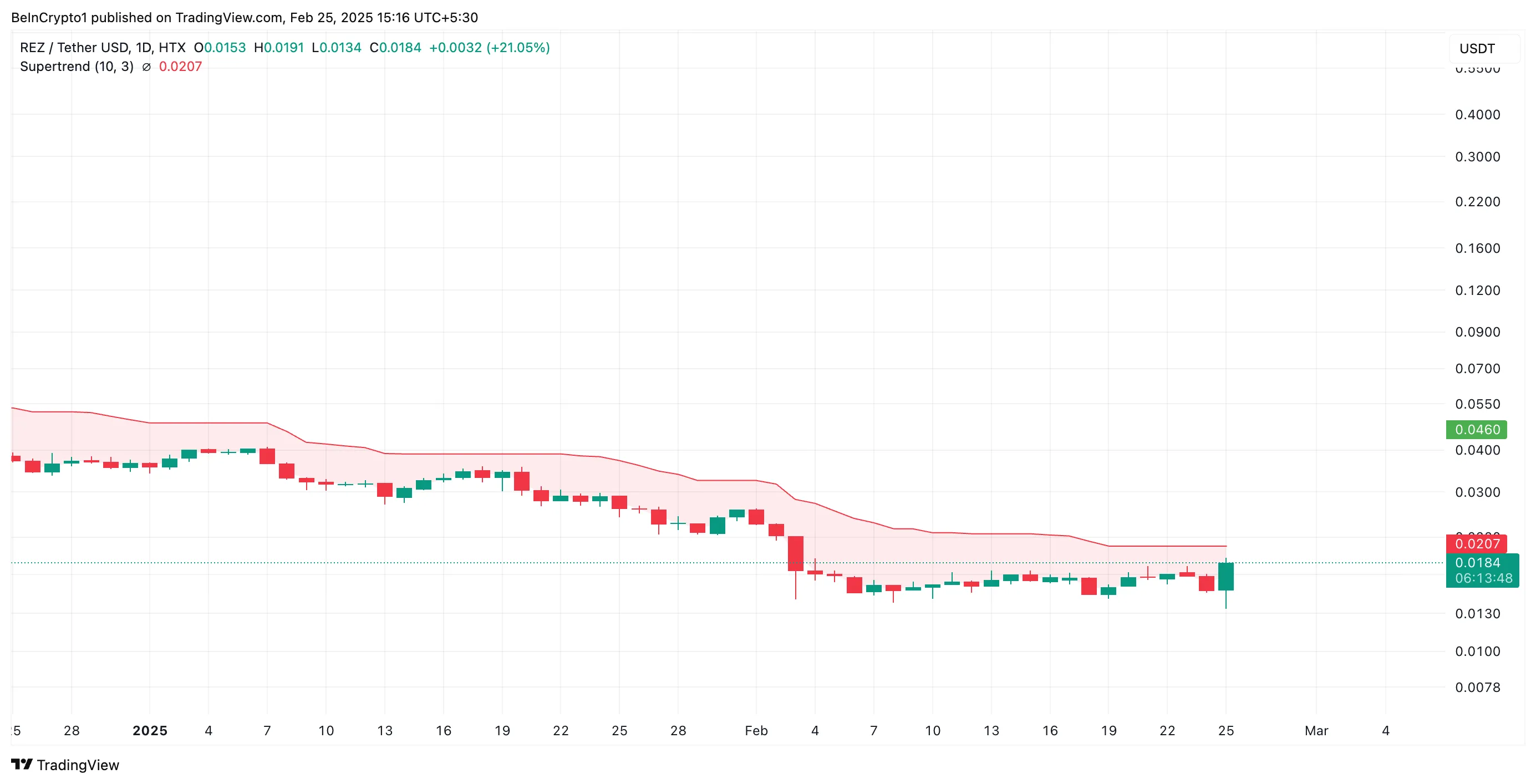 Sin embargo, si la demanda de REZ se dispara, su precio podría subir por encima de la resistencia formada por su indicador Super Trend en 0,020 dólares. Una ruptura exitosa de este nivel podría impulsar la altcoin a 0,026 dólares.