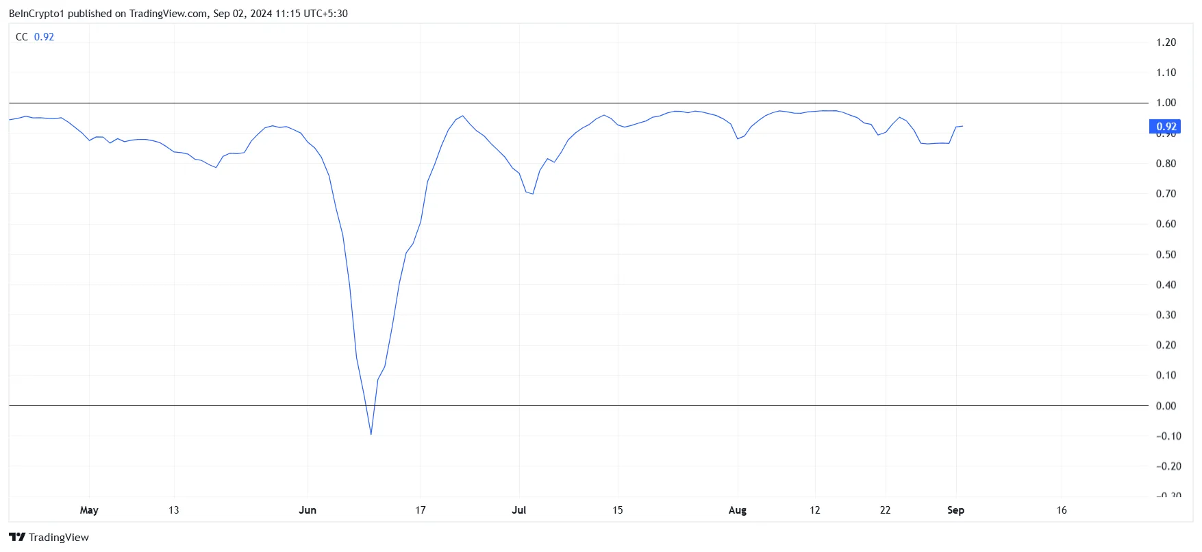 SponsoredAdemás, el impulso macro de Dogecoin está muy influenciado por Bitcoin (BTC), ya que las dos criptomonedas comparten una alta correlación de 0.92. Esta correlación significa que los movimientos de precios de DOGE están estrechamente relacionados con el rendimiento de Bitcoin. Cuando Bitcoin experimenta cambios de precio, Dogecoin a menudo hace lo mismo, aunque con diferente intensidad.