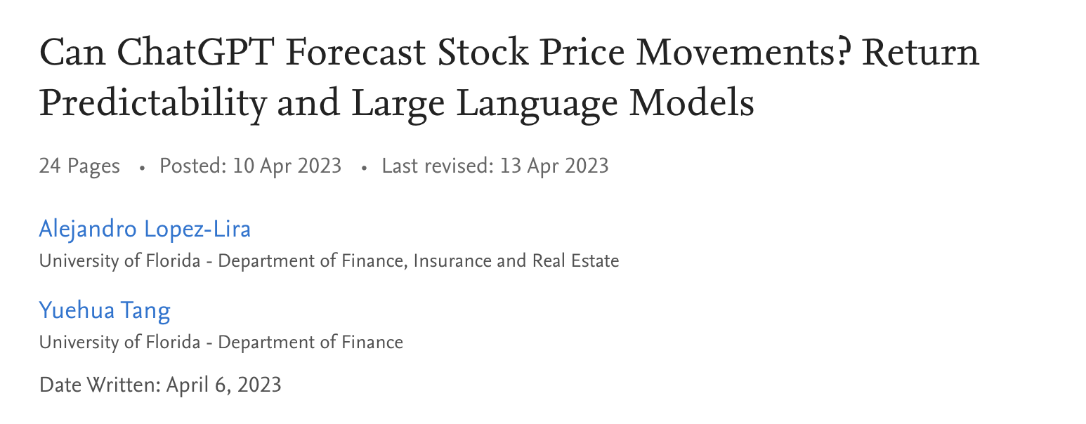 El segundo estudio llamado Can ChatGPT Forecast Stock Price Movements? Return Predictability and Large Language Models, fue realizado por la Universidad de Florida.