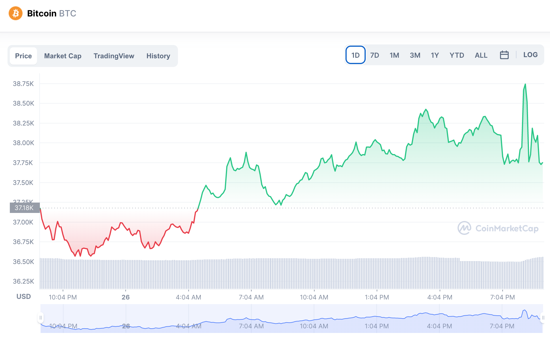 En el momento de escribir este artículo, el precio de Bitcoin no ha sufrido ni grandes ganancias ni bajadas, aunque al anunciar la Reserva Federal su decisión, a las 20:00 EST, el precio de BTC subió de manera repentina para poco después bajar a los mismos niveles, manteniéndose entre los 37.000 y 38.000 dólares.