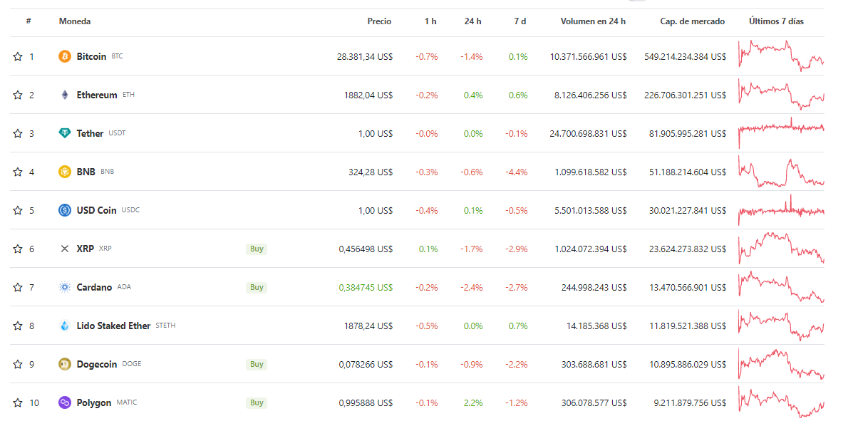 El precio de Bitcoin (BTC), la criptomoneda más grande por capitalización de mercado, ha caído un 0.7% en la última hora para cotizar en 28,381 dólares. Por su parte, Ethereum (ETH) cotiza en 1,882 dólares, cayendo 0.2% en el mismo período de tiempo.