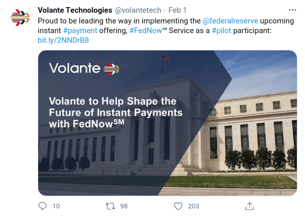 Volante Technologies anunció su participación en un programa piloto para la nueva plataforma de pago instantáneo de la Reserva Federal, FedNow.