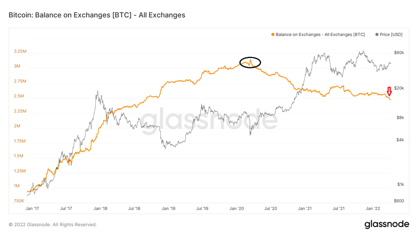 Sin embargo, se produjo otra fuerte caída a finales de marzo (flecha roja) y la cantidad de BTC en las direcciones de exchanges se encuentra actualmente en 2,473,758. Este es el valor más bajo desde septiembre de 2018.