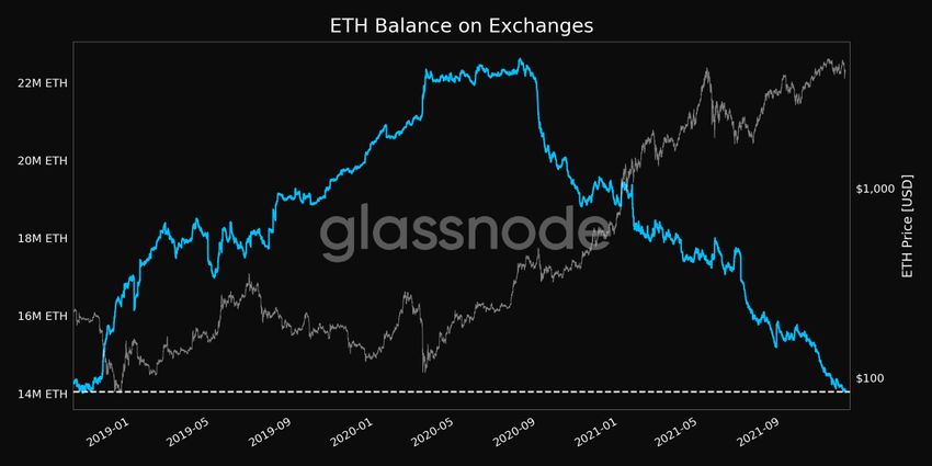 La cantidad de Ethereum en los exchanges de criptomonedas ha caído a 14 millones de ETH lo que representa un mínimo de tres año, según muestran los datos de Glassnode. En términos generales, el sentimiento del mercado en torno a Ethereum ha sido positivo, y un bajo saldo en los exchanges es otra señal de eso.