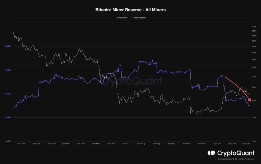 Según el gráfico, las reservas mineras de Bitcoin se encuentran ahora en sus niveles más bajos desde octubre de 2021. Han caído a 1,83 millones de BTC.