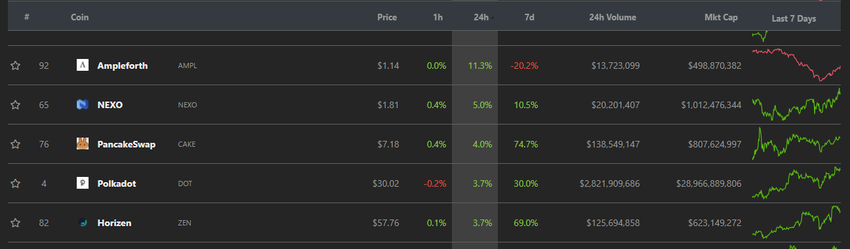 El martes, Ampleforth (AMPL) consiguió la mayor ganancia y obtuvo los máximos honores. AMPL logró aumentar un 13% en el que fue un día difícil para las altcoins. El proyecto ha recuperado tracción tras un aumento en el trading y los precios.