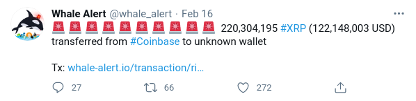 El martes 16 de febrero, Whale Alert, un usuario de Twitter que monitorea ballenas, observó que Coinbase hizo una gran transacción. La transacción de 122 millones de dólares equivale a más de 220 millones de XRP.