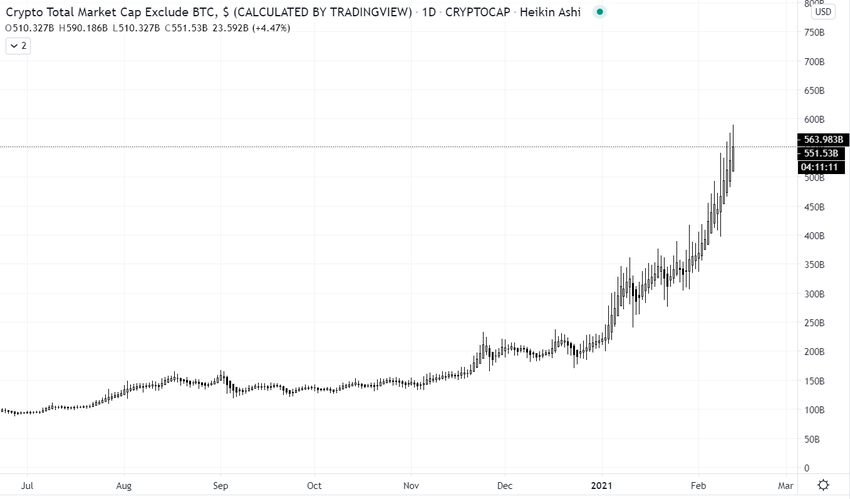 La capitalización de mercado general continúa subiendo y se mantiene en 1,4 billones de dólares. La capitalización total del mercado de altcoins alcanzó un nuevo máximo diario de 591 mil millones de dólares. Parece que las altcoins todavía tienen mucho espacio para crecer.