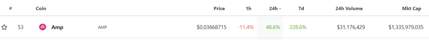 El jueves, AMP fue el mayor ganador del top 100. El proyecto, relativamente nuevo, tuvo un aumento de casi el 50%, pasando de 0,024 a 0,036 dólares. AMP afirma ser un nuevo token de garantía digital que ofrece garantía instantánea verificable para cualquier tipo de transferencia de valor.