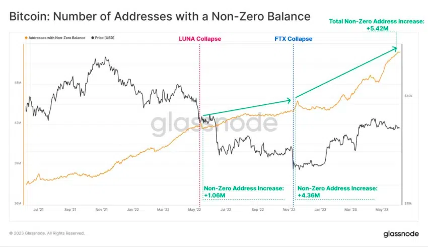 La cantidad de direcciones de Bitcoin que contienen una cantidad distinta de cero de BTC continúa aumentando, y recientemente alcanzó otro máximo histórico.