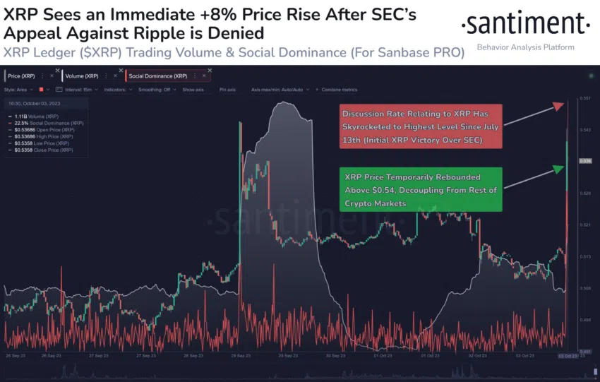 La Comisión de Bolsa y Valores de Estados Unidos (SEC) obtuvo una nueva derrota frente a Ripple cuando el Tribunal de Distrito de Nueva York rechazó la solicitud de apelación sobre la decisión que determinó que XRP no es un valor para las ventas minoristas. La decisión provocó un impacto positivo en el precio de XRP, el cual aumentó más de 8%.