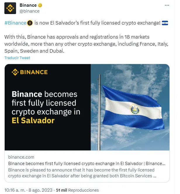 Este martes 8 de agosto, Binance recibió la autorización por parte de dos reguladores de El Salvador para operar en ese país. Con esto, el mayor exchange del mundo se convertirá en el primero con dos licencias para operar en el país centroamericano.