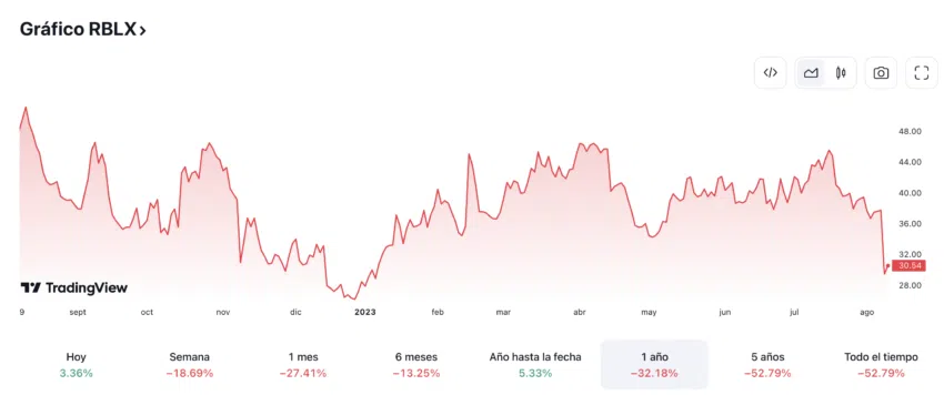 Las acciones de la plataforma de videojuegos en el metaverso, Roblox, cayeron 20% tras presentar los resultados de su segundo reporte trimestral y no cumplir las expectativas de Wall Street. Las acciones pasaron de 37,99 a 29,85 dólares en menos de una hora el 09 de agosto.