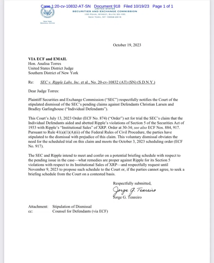En un nuevo evento significativo para el mundo de las criptomonedas, se dio a conocer que se ha desestimado la demanda de la Comisión de Bolsa y Valores de EE. UU. (SEC) contra los fundadores de Ripple, Brad Garlinghouse y Chris Larsen. Tras la noticia, el token XRP se disparó más del 5%.