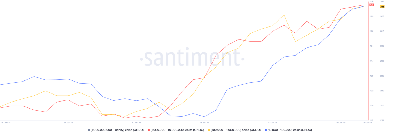 Las ballenas compraron varias altcoins prometedoras en enero, posicionándose para posibles ganancias en febrero de 2025. ONDO experimentó una acumulación agresiva a medida que el interés en los Activos del Mundo Real (RWA) aumentó, mientras que VIRTUAL atrajo compradores a pesar de una corrección brusca en el sector de la IA.