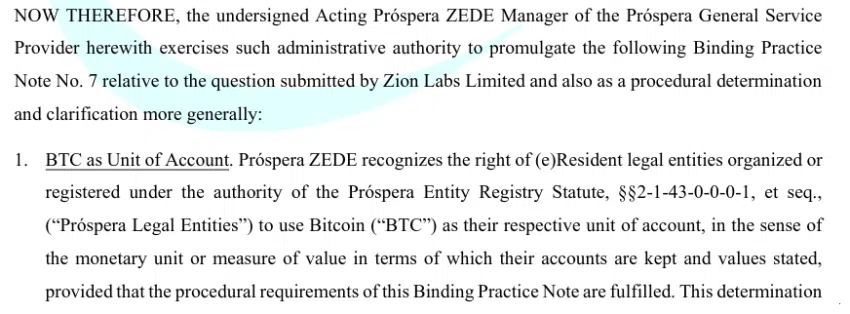 La zona económica especial (ZEDE) Próspera de Honduras ha adoptado oficialmente a la criptomoneda líder, Bitcoin (BTC), como unidad de cuenta. De esta forma, se reconoce al activo digital en diversas transacciones comerciales, fiscales y financieras.