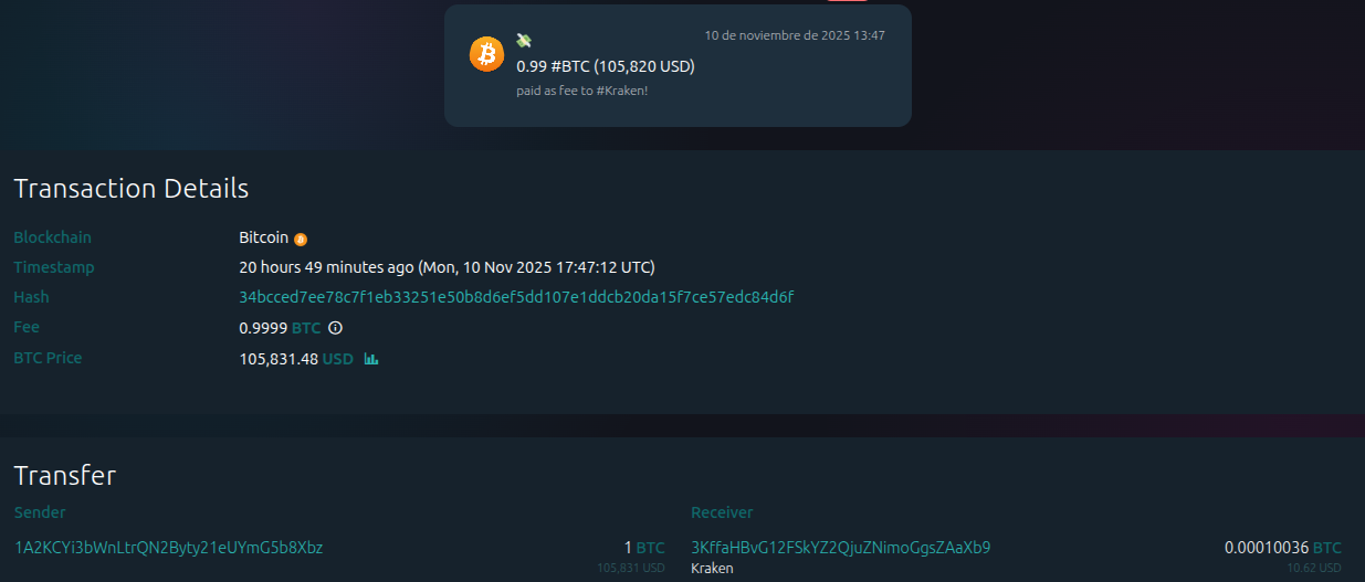 La comisión de Bitcoin de 105,000 dólares pagada por error en una transacción de apenas 10 dólares a Kraken se convirtió en el tema más comentado del ecosistema cripto en las últimas horas. El usuario introdujo manualmente una tarifa de 0.99 BTC en lugar de permitir que su monedero la calculase de forma automática.