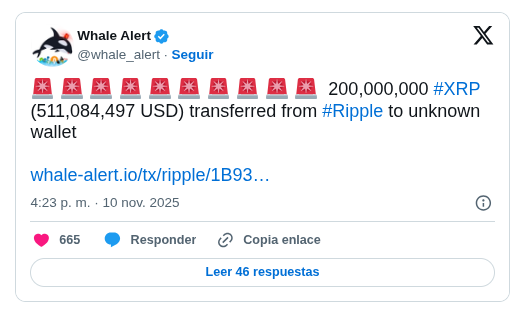 La reciente transferencia masiva de Ripple encendió las alarmas en el mercado de criptomonedas. Whale Alert reportó el 10 de noviembre de 2025 una transacción de 200 millones de XRP, valorada en aproximadamente 511 millones de dólares, desde un monedero asociado a Ripple Labs hacia una nueva wallet.