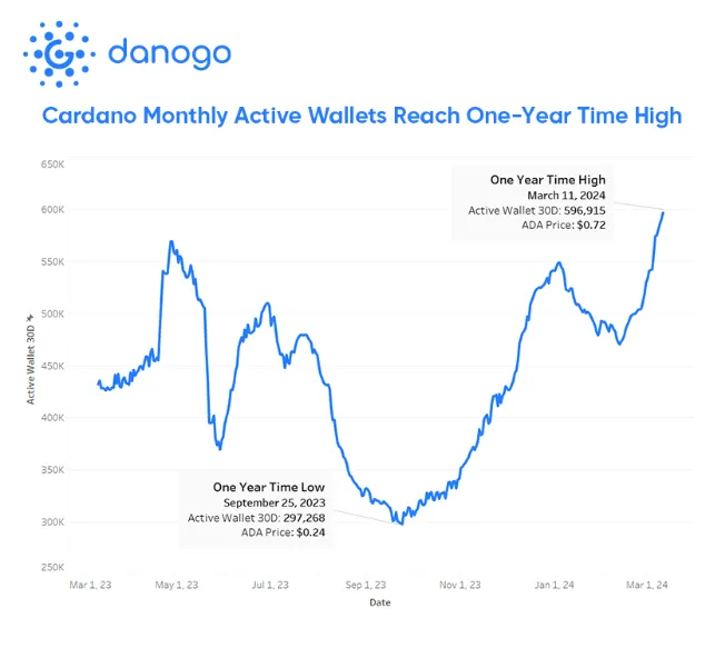 En un repunte impresionante, Cardano, la blockchain líder de Capa 1, está registrando un máximo de un año en actividad on-chain. En los últimos 30 días se reportaron casi 600,000 monederos activos.