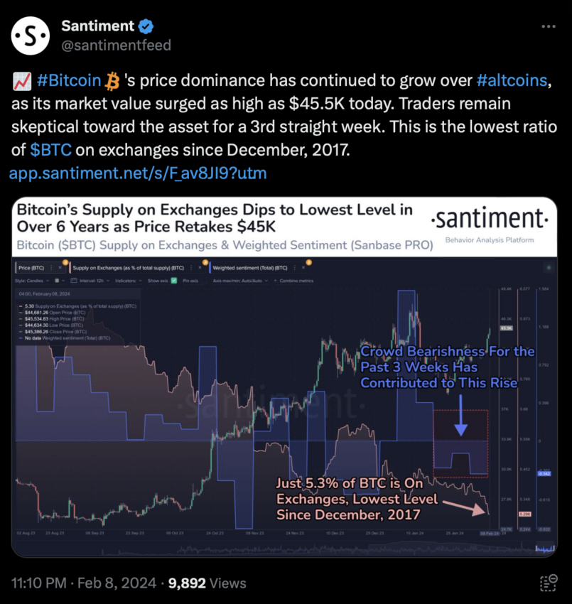 Suministro de Bitcoin (BTC) en exchanges centralizados cae a un mínimo de 6 años