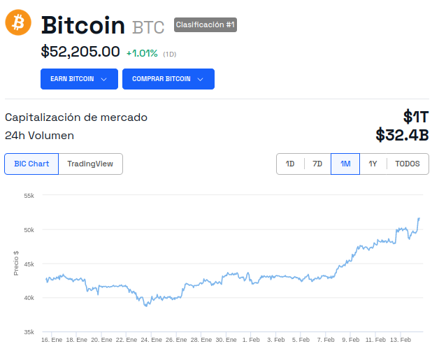 En un mes de febrero que ha sido positivo para el mercado de las criptomonedas, Bitcoin logró superar la marca de los 50,000 dólares por primera vez desde diciembre de 2021.