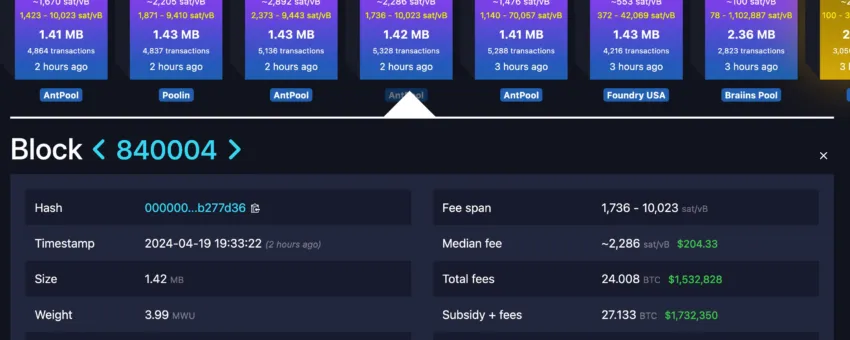 A las 18:09 Central Standard Time (CST) del 19 de abril de 2024 se completó el halving de Bitcoin, al reducir a la mitad las recompensas de minería de BTC. El próximo halving sucederá aproximadamente el 04 de marzo de 2028. A partir de ahora se reconfigurará el mercado de las criptomonedas.