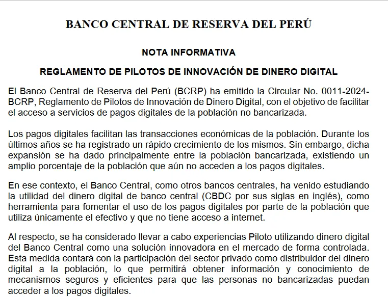 El Banco Central de Reserva del Perú (BCRP) ha lanzado su piloto de “CBDC soberana” de manera oficial con la emisión de la Circular No. 0011-2024-BCRP. El cual que establece el Reglamento de Pilotos de Innovación de Dinero Digital. Esta medida tiene como objetivo principal facilitar el acceso a servicios de pagos digitales para la población no bancarizada del país.