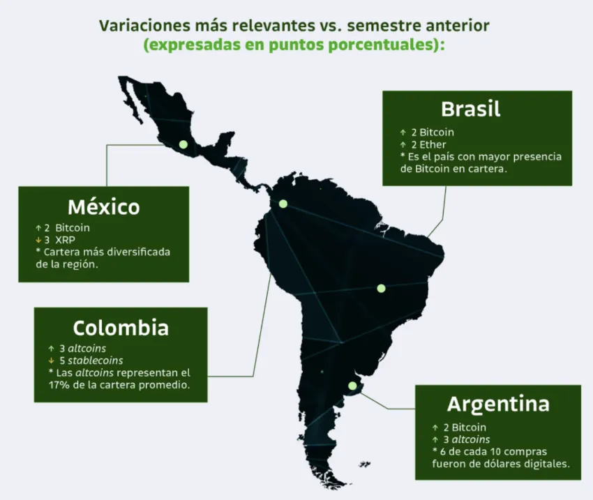 El exchangemexicano de criptomonedas, Bitso, explicó en su último reporte que Bitcoin representa el 53% de las carteras de América Latina, y representa el 28% de las compras regionales, siendo México el que más compra Bitcoin (30%). Otros países de Latinoamérica con más compras de BTC son: Brasil, Colombia y Argentina, con 24%, 19% y 12%, respectivamente.