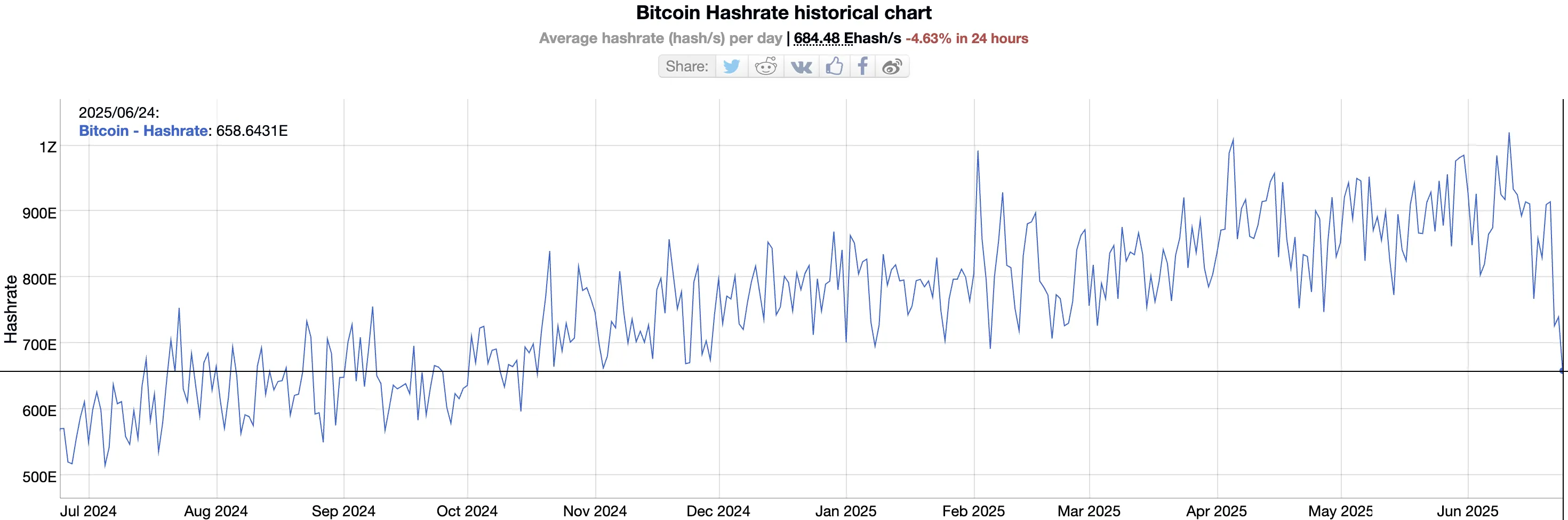 Según datos de BitInfoCharts, el hashrate promedio diario de Bitcoin ha caído a 684.48 EH/s, el nivel más bajo desde mediados de octubre del año pasado.