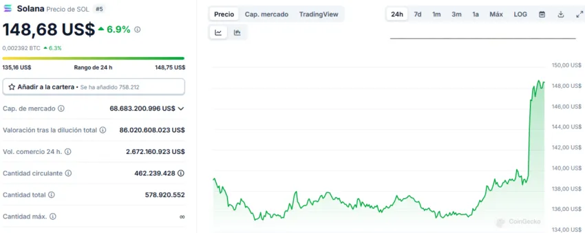 La noticia ha provocado un aumento de casi el 7% en el valor de SOL. Fuente: CoinGecko