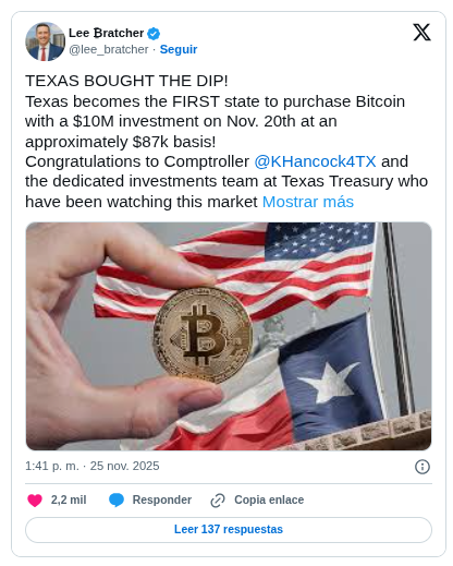 Texas hace historia en EEUU y ejecuta compra de Bitcoin para su Reserva Estratégica