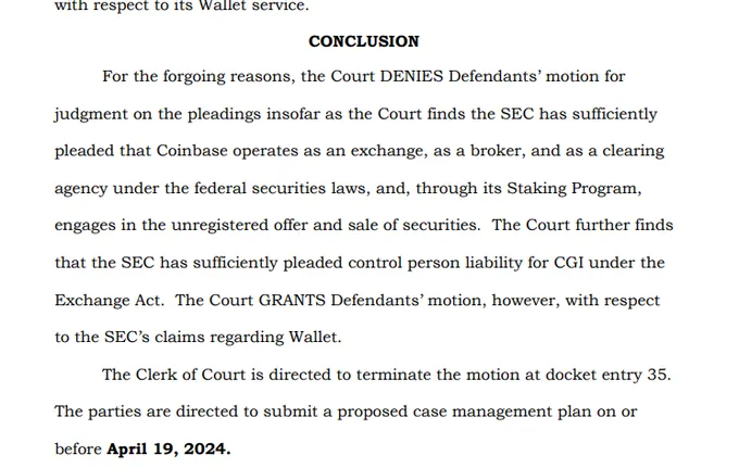 La jueza de distrito estadounidense Katherine Polk Failla ha denegado la moción de Coinbase para desestimar la demanda de la Comisión de Bolsa y Valores (SEC). La demanda de la SEC alega que Coinbase opera como exchange, broker y agencia de compensación no registrada y afirma que su programa de staking implica la oferta y venta de valores no registrada.