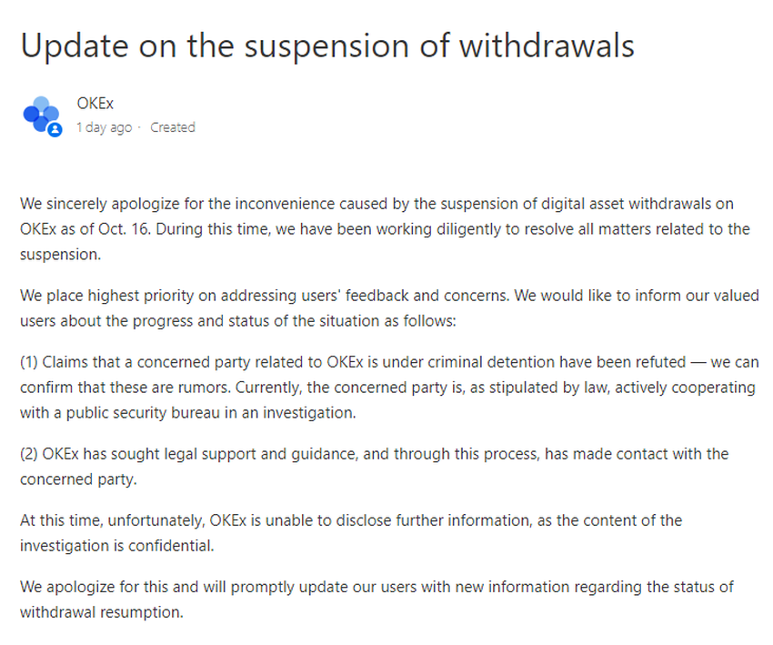 OKEx anunció el 6 de noviembre que los retiros aún están suspendidos. El exchange había suspendido los retiros a raíz de informes que decían que Star Xu, fundador de OKEx, había sido arrestado. Ahora el exchange dice que “las afirmaciones de que alguien relacionado con OKEx está bajo detención criminal han sido refutadas, podemos confirmar que se trata de rumores”.