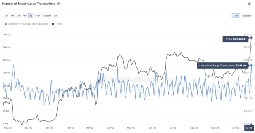 Según datos de IntoTheBlock, este aumento en las transacciones coincide con el reciente repunte del activo por encima de los 34.000 dólares.