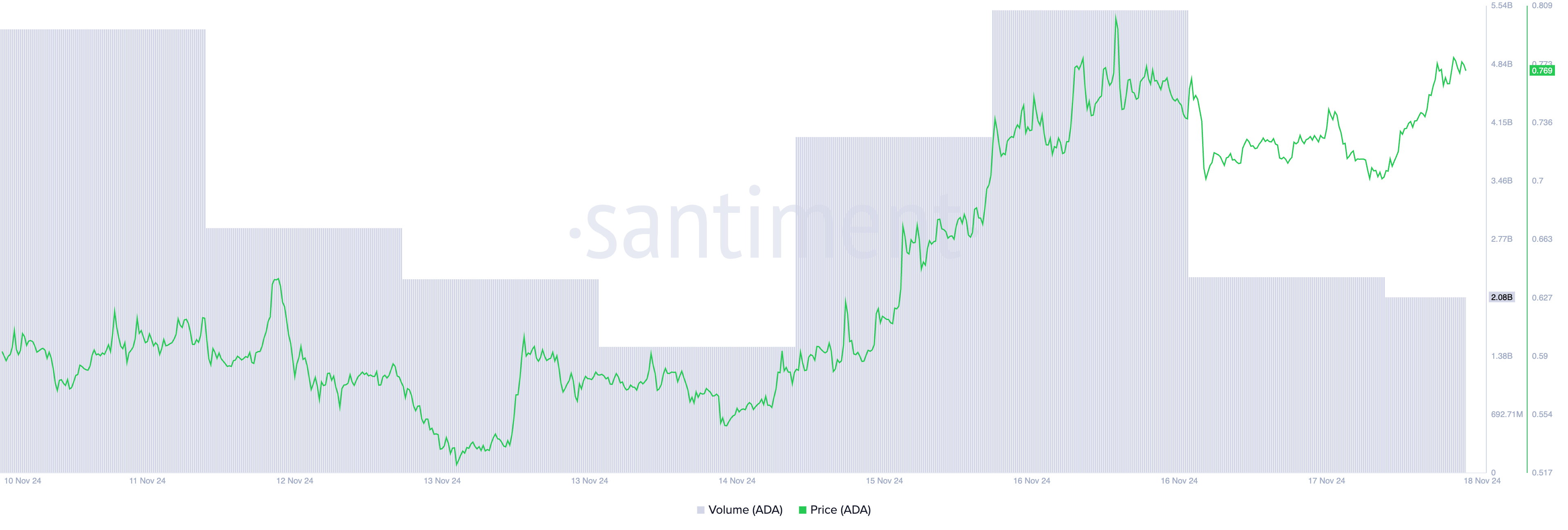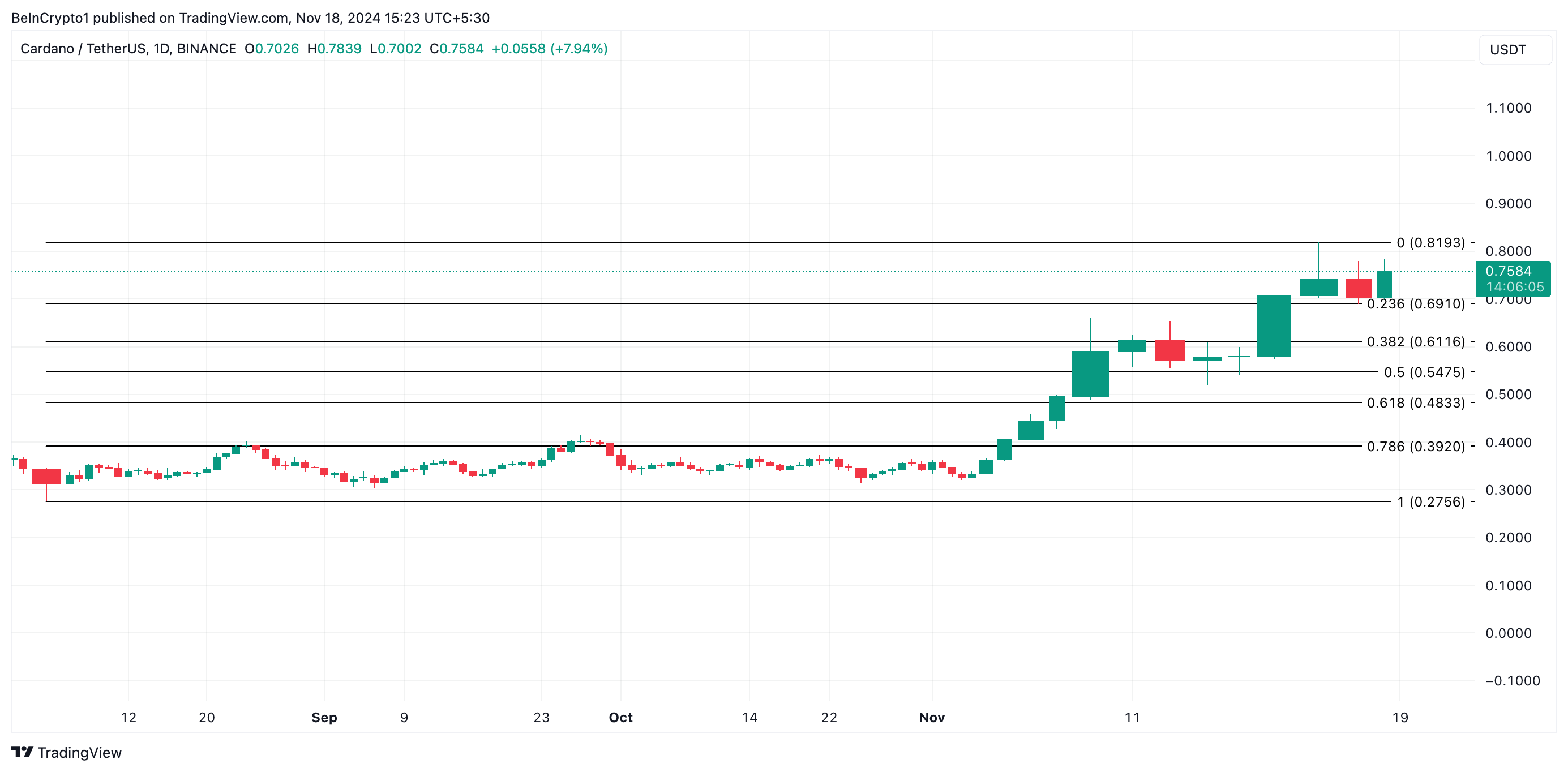 Cardano (ADA) ha experimentado ganancias constantes durante las últimas dos semanas, alcanzando un máximo de dos años de 0.81 dólares antes de experimentar un ligero retroceso. Actualmente se negocia a 0.75 dólares, lo que marca un descenso del 5% desde su pico.