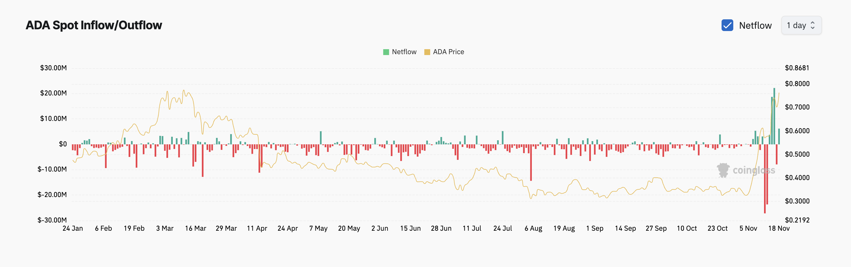La evaluación de BeInCrypto del flujo neto de Cardano en exchanges ha mostrado un pico en las entradas durante las últimas 24 horas, indicando actividad de toma de ganancias. A las 9:16 UTC del lunes, los datos de Coinglass muestran que la altcoin ha registrado entradas netas por un total de 7,21 millones de dólares.