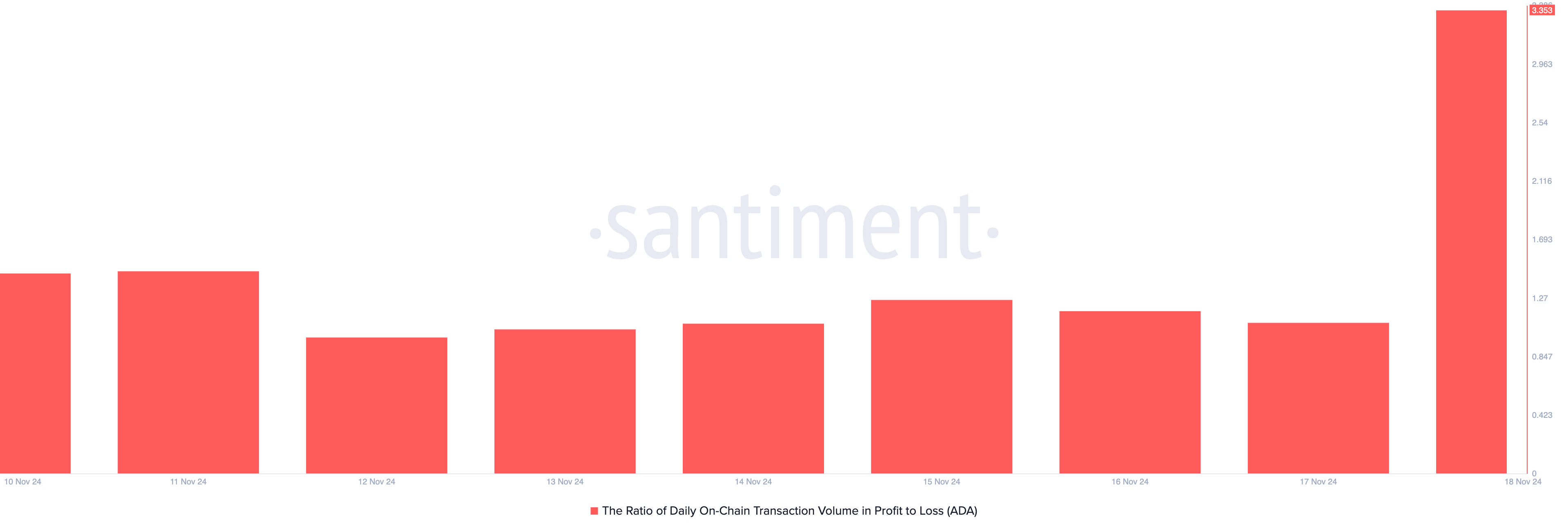 SponsoredNotablemente, el lunes, las transacciones que involucran a ADA han sido significativamente rentables. Según los datos de Santiment, la relación del volumen de transacciones diarias on-chain en ganancias frente a pérdidas actualmente se sitúa en 3.35. Este representa su valor más alto en un solo día desde junio de 2020.