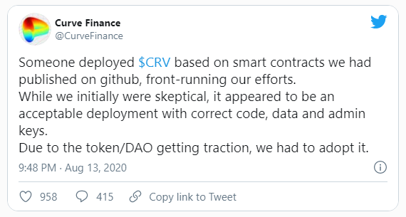 El 14 de agosto de 2020, un desarrollador anónimo lanzó repentinamente el token CRV. Nadie, incluido el equipo de Curve Finance, sabía que estaba sucediendo.