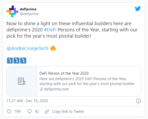 De hecho, el aumento de popularidad del espacio DeFi se debe al impresionante desarrollo en el espacio, liderado en parte por Yearn Finance de Andre Cronje. El desarrollador comprometido de DeFi también fue nombrado por DeFi Prime como Persona DeFi del año 2020.