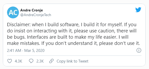 “Cuando creo software, lo hago por mí mismo. Si insiste en interactuar con él, tenga cuidado, habrá errores “.