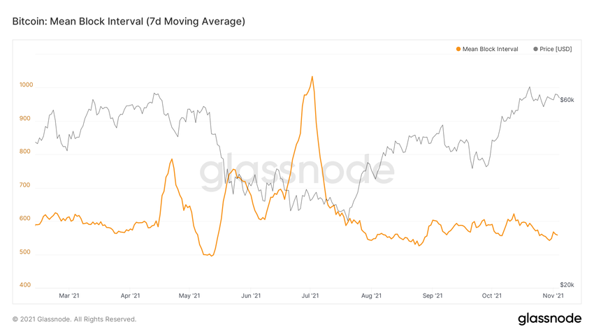 El intervalo de bloque medio mide cuánto tiempo lleva extraer un bloque. El indicador suele oscilar entre 500 y 600 segundos. Los picos ascendentes o descendentes se corrigen posteriormente mediante una disminución o aumento en la dificultad de minería.