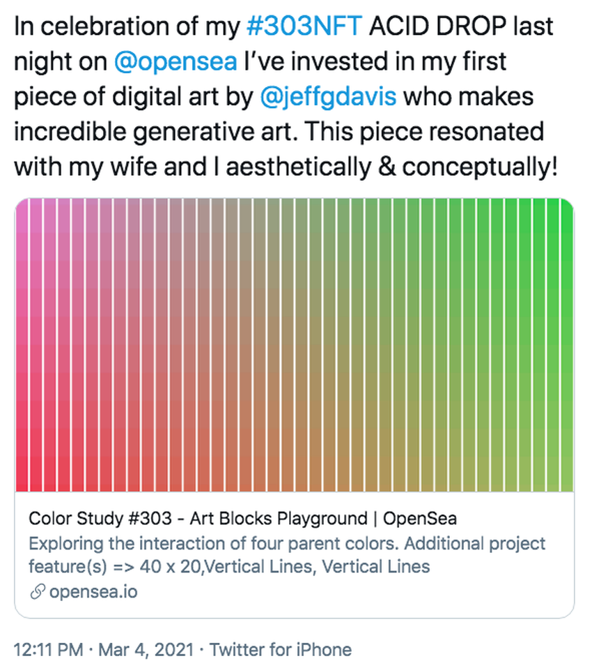 Seguidamente y para celebrar el lanzamiento de esta colección, el Dj y productor británico-canadiense anunciaba que había invertido en una obra de arte del critpo artista afincado en Arizona Jeff Davis. Se trata de una pieza de su colección Color study una pieza de arte generativo lanzada a través del portal art blocks.