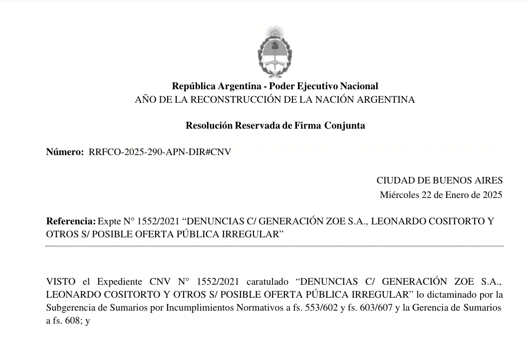 El 05 de febrero de 2025, la CNV de Argentina absolvió a Leonardo Cositorto y Generación Zoe, al considerar que el empresario y su empresa no infringieron la ley de mercado de capitales. No obstante, autoridades no lo eximen del pago de una multa, lo cual no significa que haya sido exonerado en su totalidad. El acusado acusó “una mafia política del gobierno anterior” en su contra.