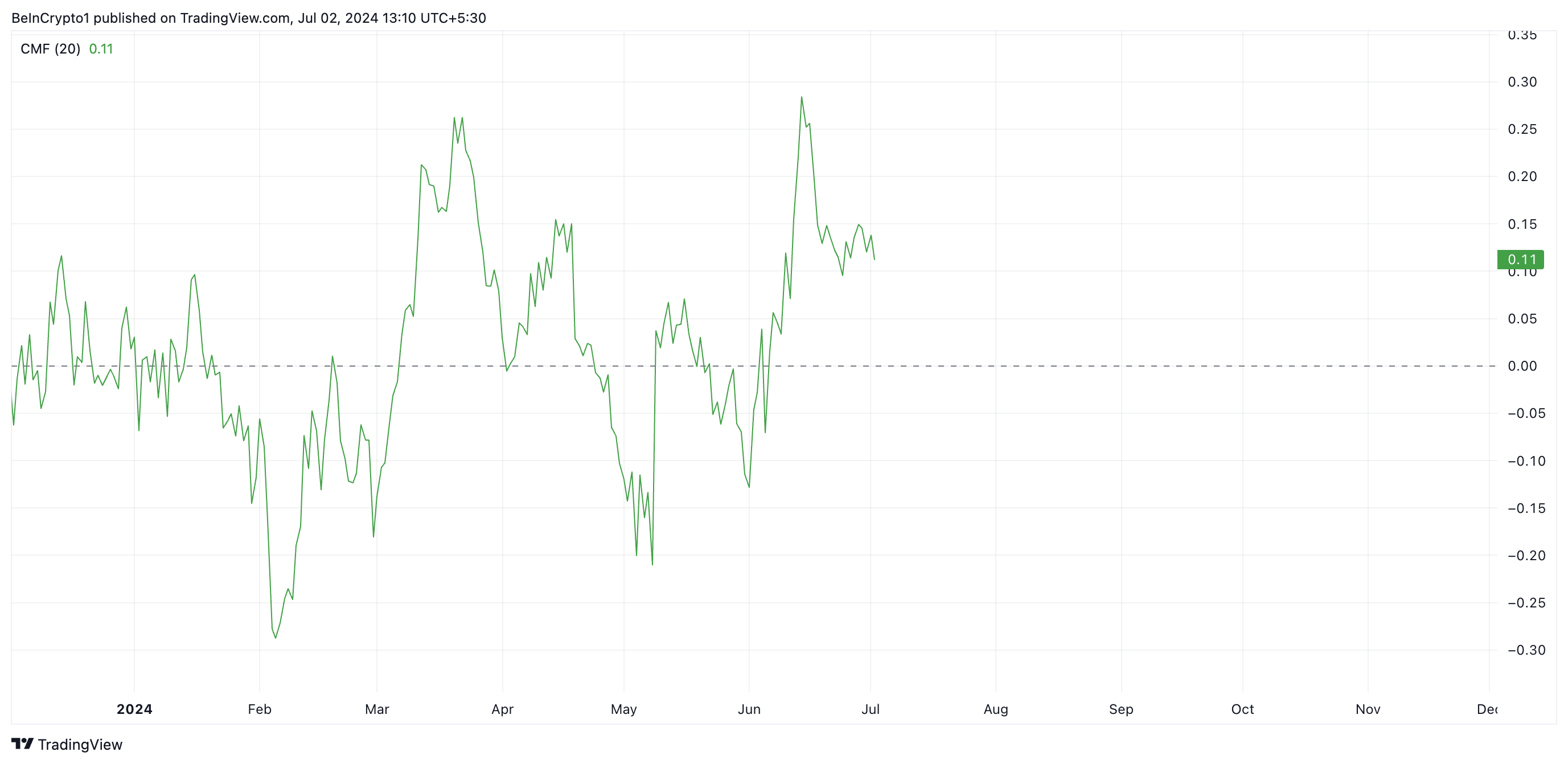 A pesar del rally de precios de TON en el último mes, el indicador Chaikin Money Flow (CMF) ha mostrado una tendencia descendente desde el 15 de junio.