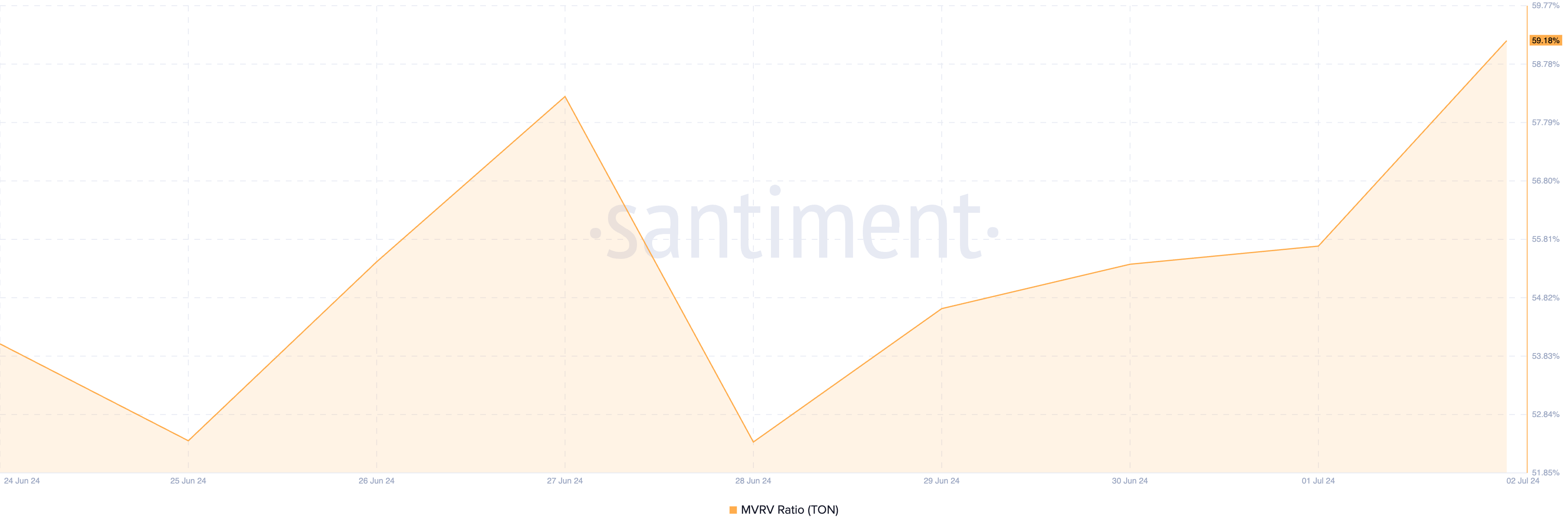 Confirmando que TON está sobrevalorado, su ratio de Valor de Mercado a Valor Realizado (MVRV) es del 59.18%. El MVRV rratio de un activo mide la relación entre su precio actual y el precio promedio al que se adquirieron todas sus monedas o tokens.